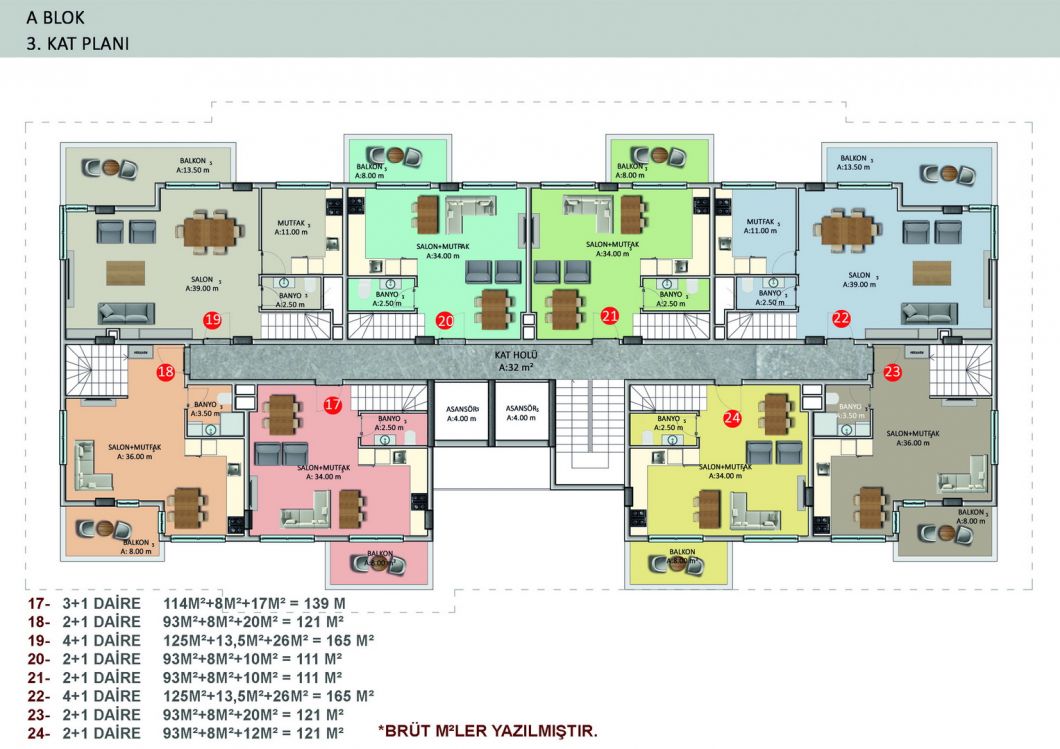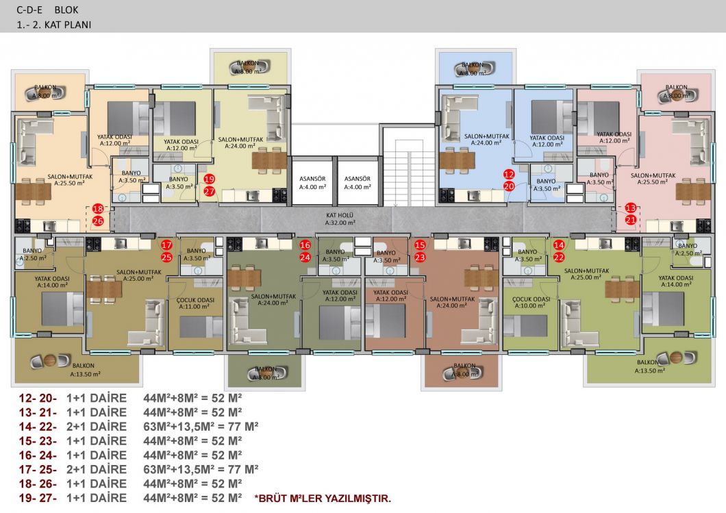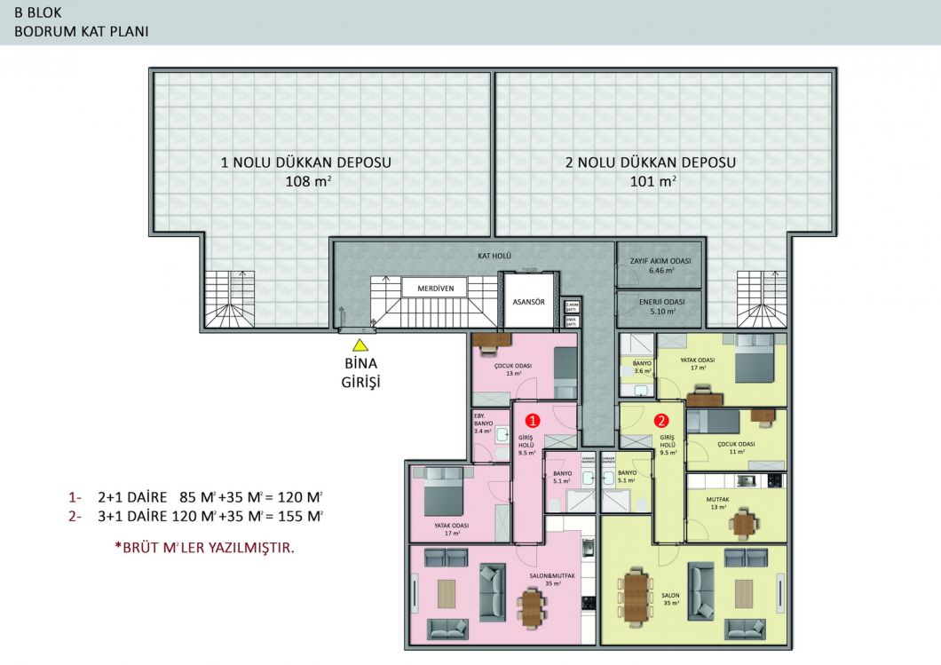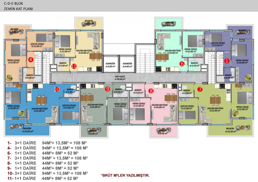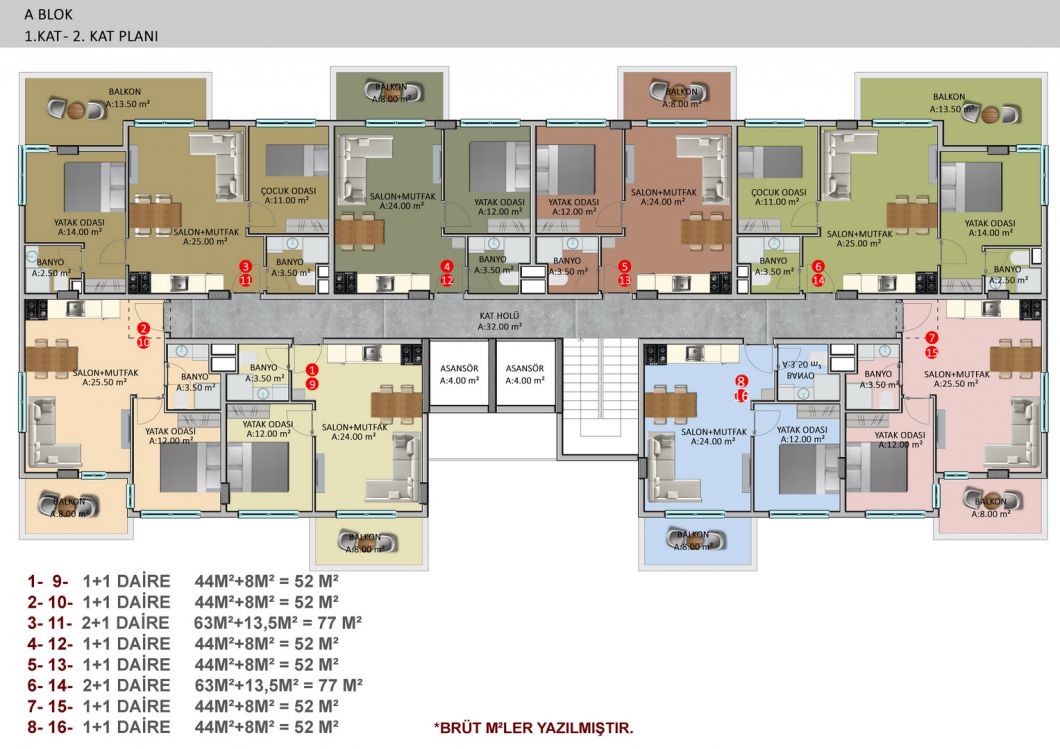 The complex will consist of six 4-storey residential blocks, 180 apartments with different layouts and area from 50 m2 to 205 m2. There is a wide selection of one bedroom apartments; comfortable and spacious two-bedroom apartments, luxurious two-story duplexes with two and three bedrooms. Ground floor duplexes with garden access, three bedroom apartments with separate kitchens.We present to your attention two furnished 1+1 apartments, each 55 m², on the second and third floors. They are for sale as shown in the photos.